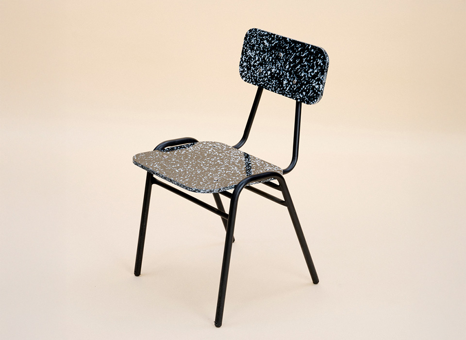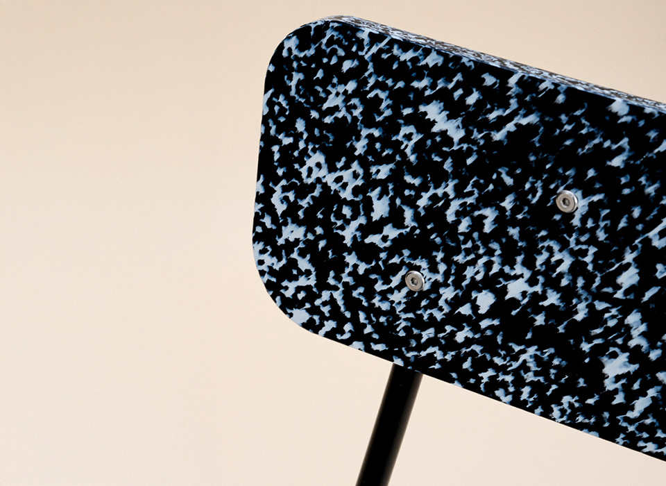 Asiento y respaldo de panel simple es una sola pieza de material reciclado fluxPS, con la superficie pulida mate, cantos redondeados. Estructura metálica y electropintada.
