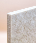 Panel de plástico PS 100% reciclado y reciclable. Material de gran carácter estético y funcional hecho a partir de una fusión de diferentes plásticos de poliestireno reciclado post industrial. Color: beige, blanco traslúcidos y crema . Especial para espacios elegantes, sofisticados y naturales.